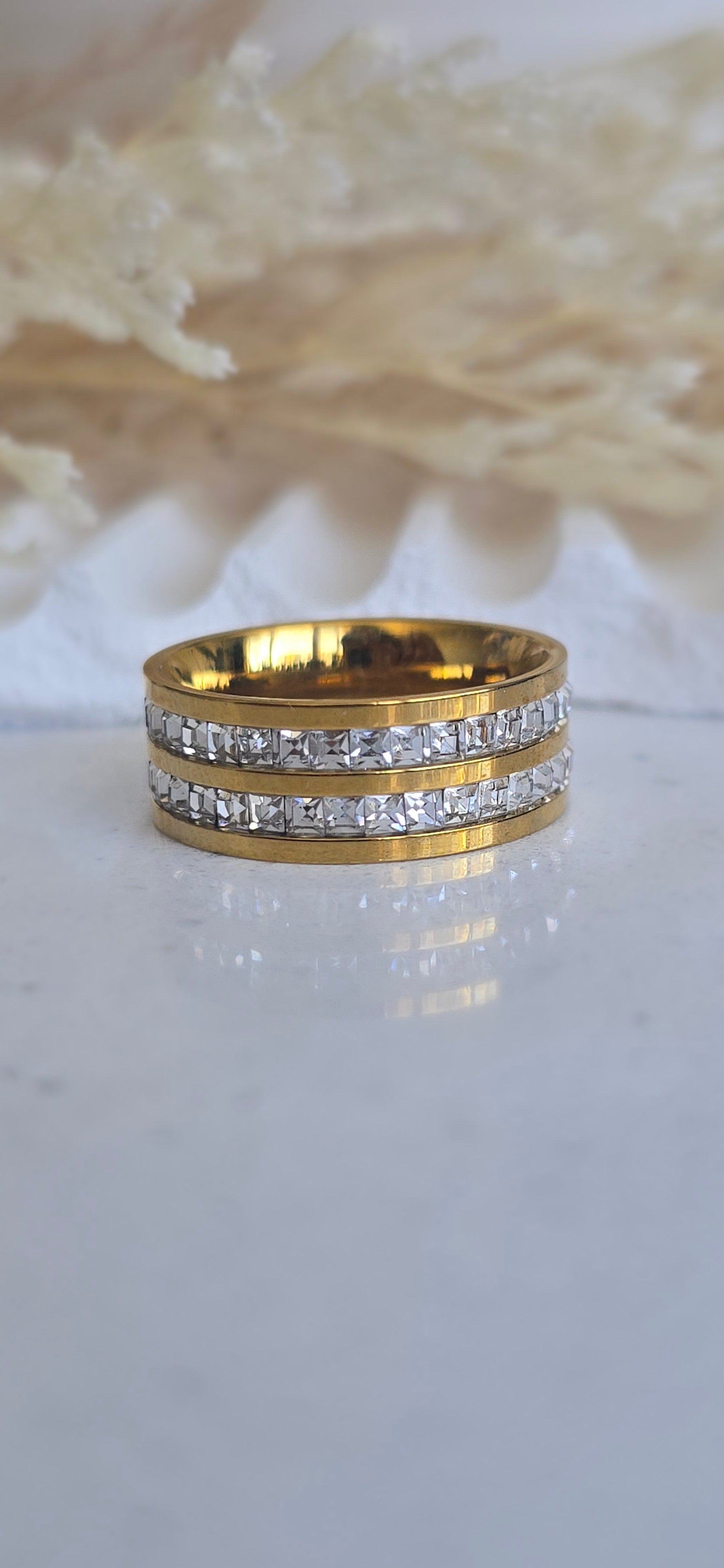 Elevate your everyday style with this sophisticated ring, crafted from durable stainless steel and finished in a luxurious gold tone. The design features three stunning rows of crystals that catch the light with every movement, adding a touch of glamour to any outfit. Whether you're dressing up for a special occasion or adding a refined accent to your daily look, this ring promises enduring shine and elegance.