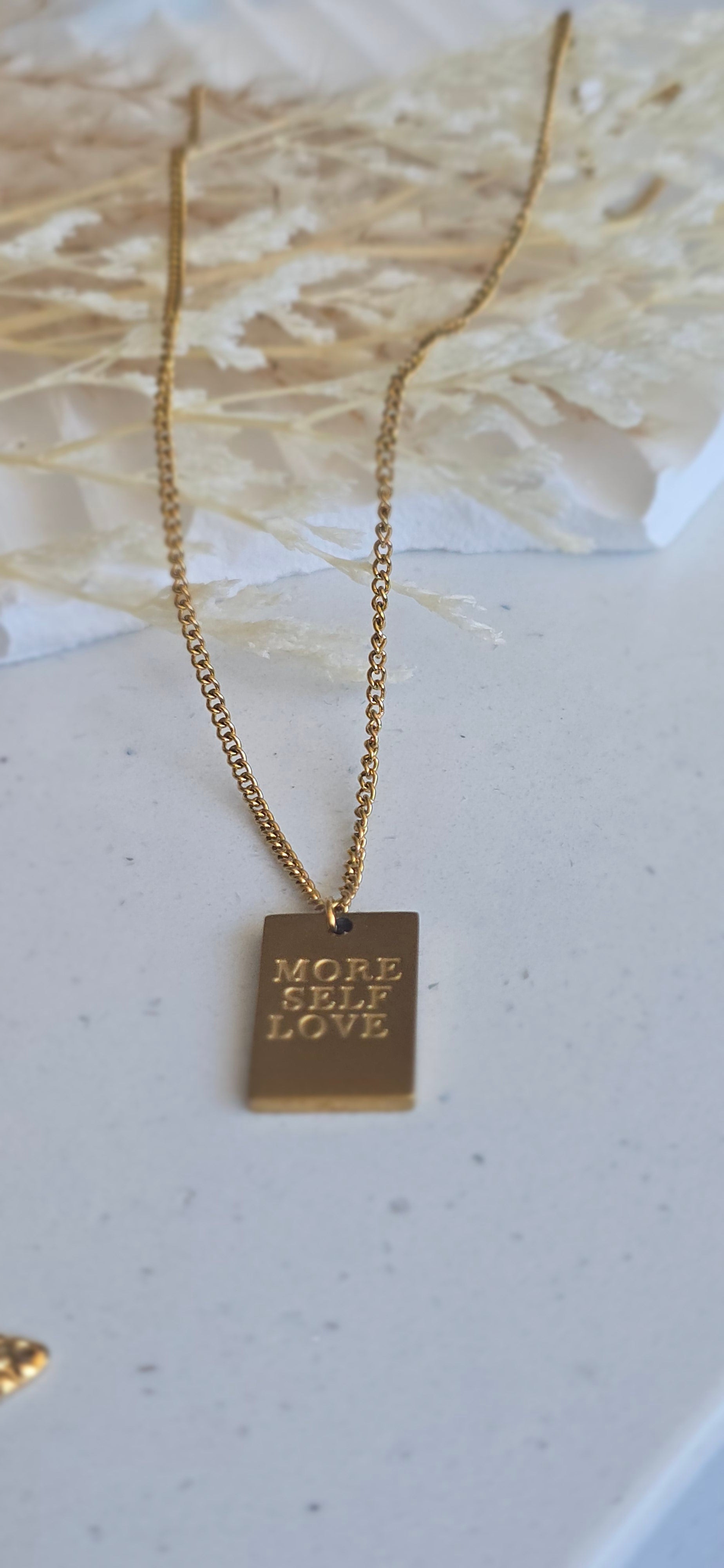 This necklace features a meaningful charm engraved with the message "More Self Love," serving as a gentle reminder to embrace self-care and positivity. Its simple yet stylish design makes it perfect for casual wear, offering both comfort and inspiration. Whether worn alone or layered with other pieces, this necklace is a beautiful expression of self-love and confidence.